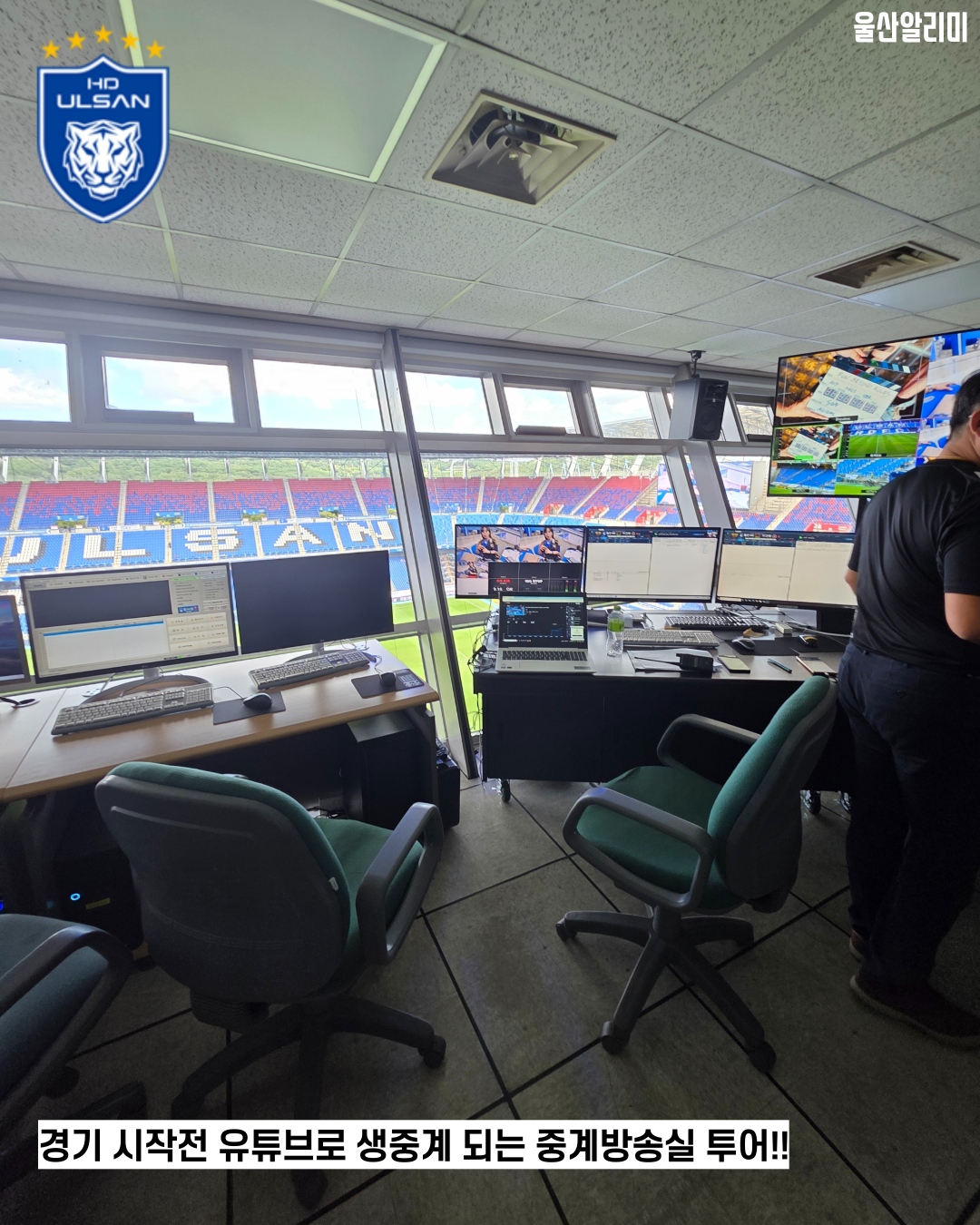 여기는 울산 문수경기장의 모든 구역이 한눈에 들어오면 중계방송실 입니다. 유튜브 중계라던지 경기시작전에 중계되는 모든 방송 컨트롤을 하는 곳이라고 보면 되겠습니다.