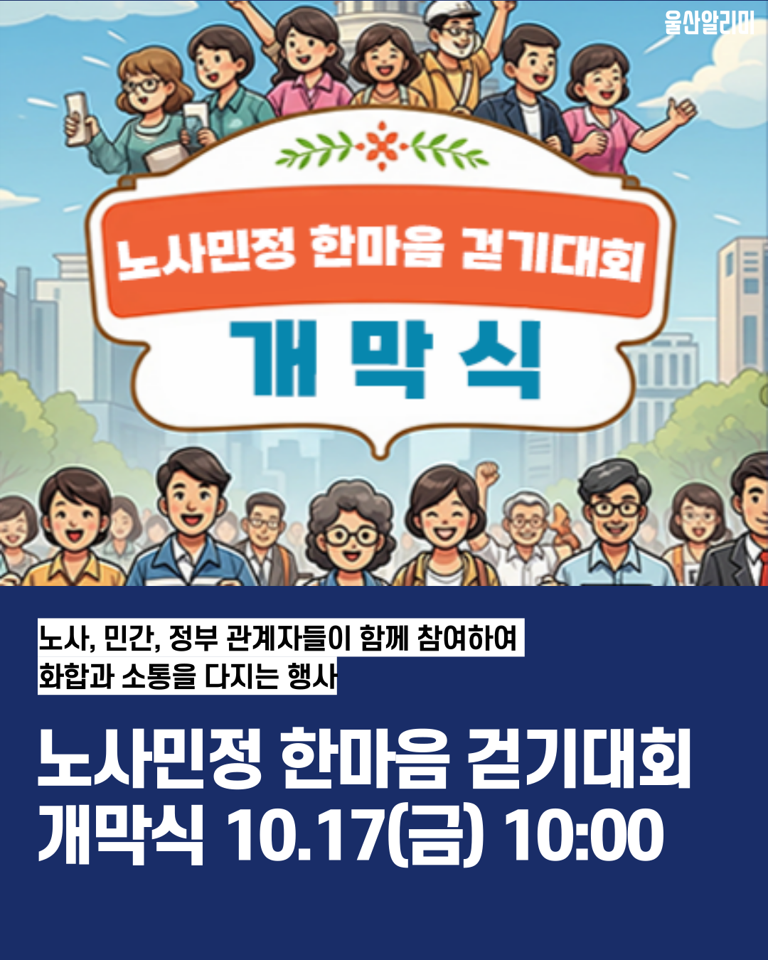 노사, 민간, 정부 관계자들이 함께 참여하여 화합과 소통을 다지는 행사 노사민정 한마음 걷기대회가 열립니다.