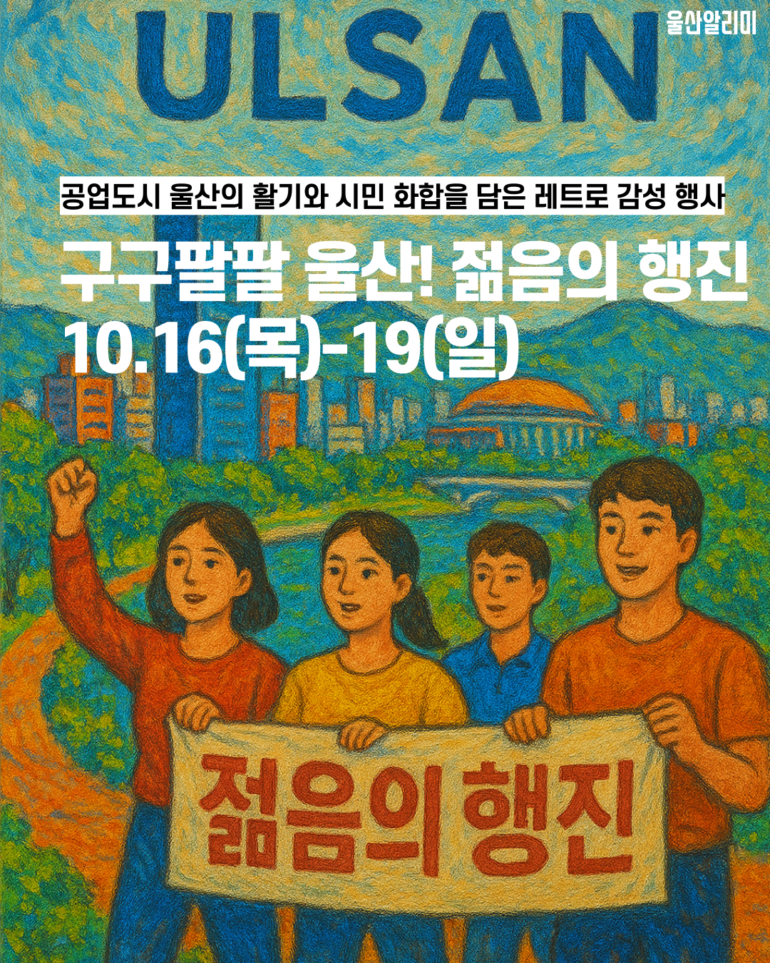 첫번째 구구팔팔 울산 젊음의 행진입니다. 공업도시 울산의 활기와 시민 화합을 담은 레트로 감성 행사로 10월 16일부터 개최 됩니다.
